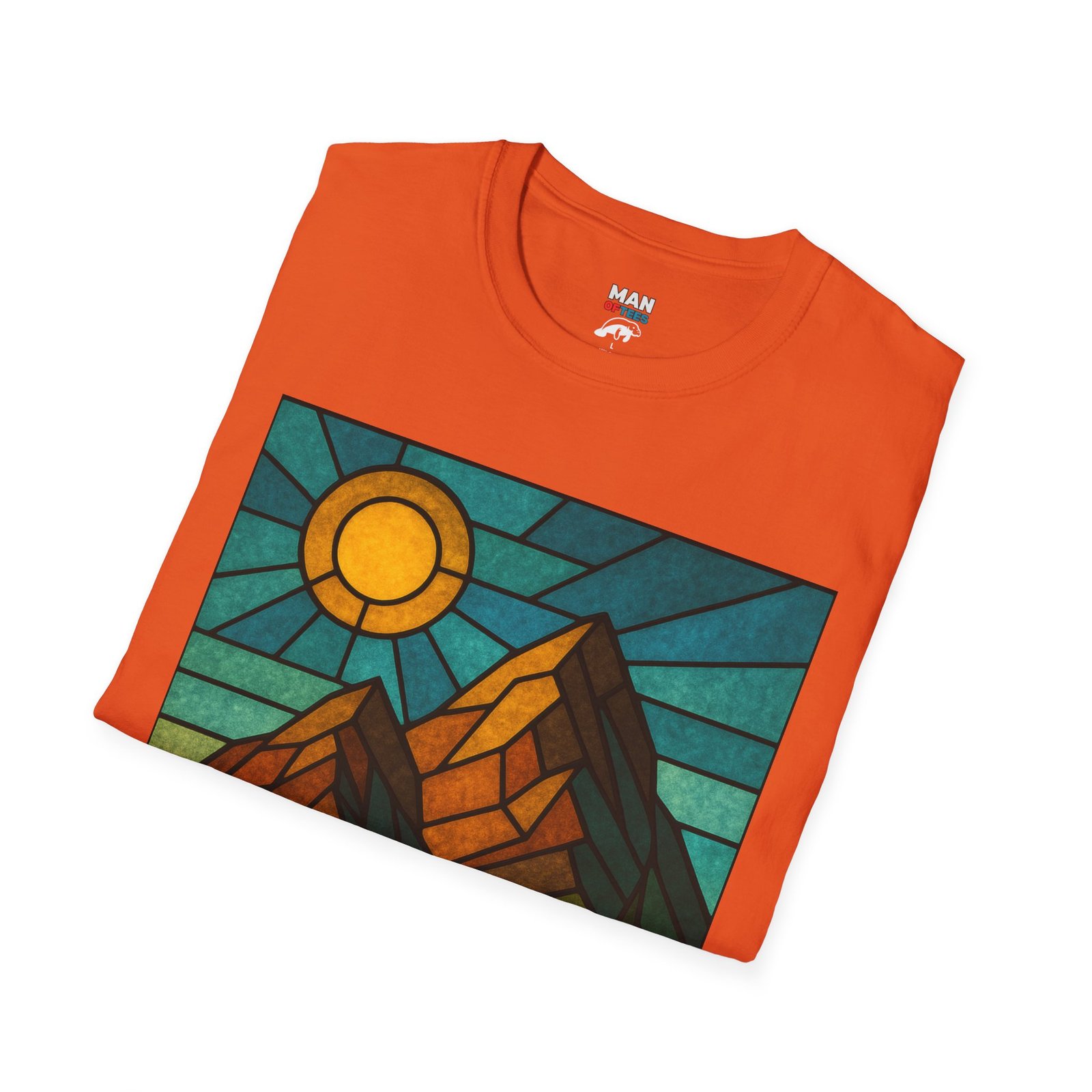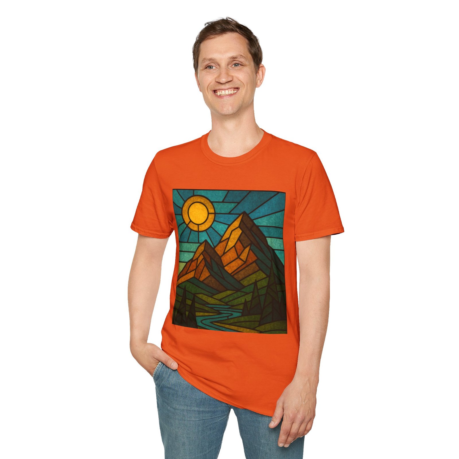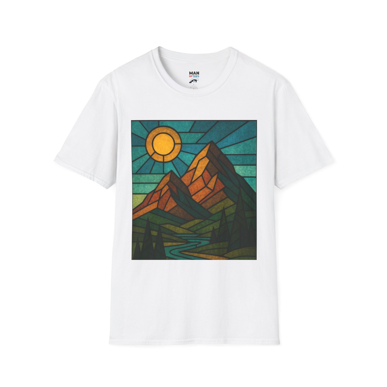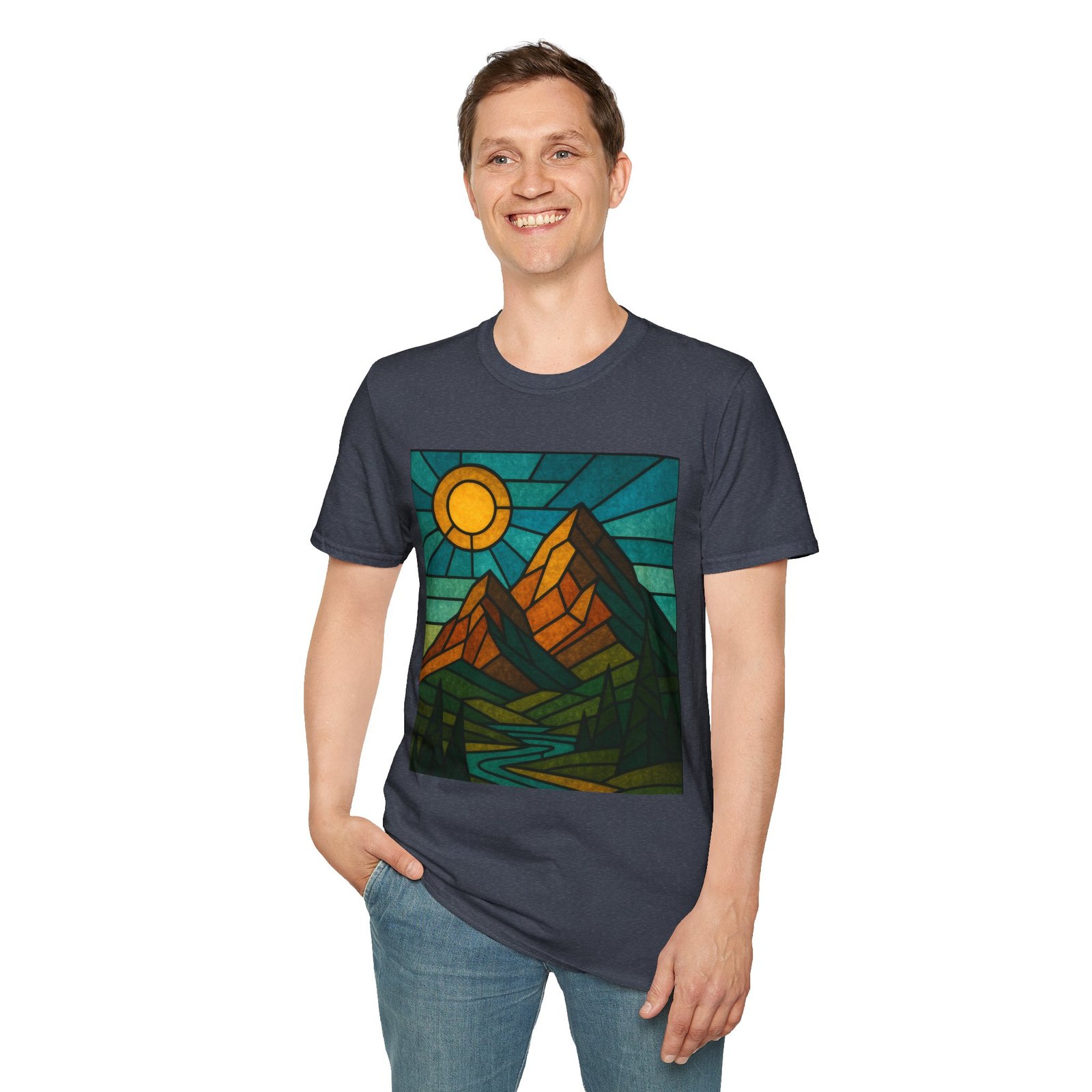 A unisex softstyle T-shirt featuring a stained glass style mountain range with a sun and blue skies behind. This T-shirt is perfect for nature lovers and outdoor enthusiasts. It gives off a peaceful and adventurous vibe, fitting into a buyer’s casual wardrobe seamlessly. Ideal for those who enjoy hiking, camping, or exploring the great outdoors. Relevant for Earth Day, hiking trips, and summer adventures.