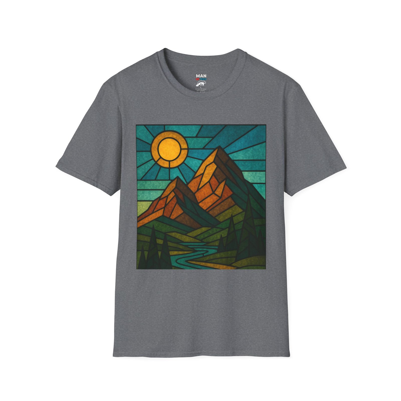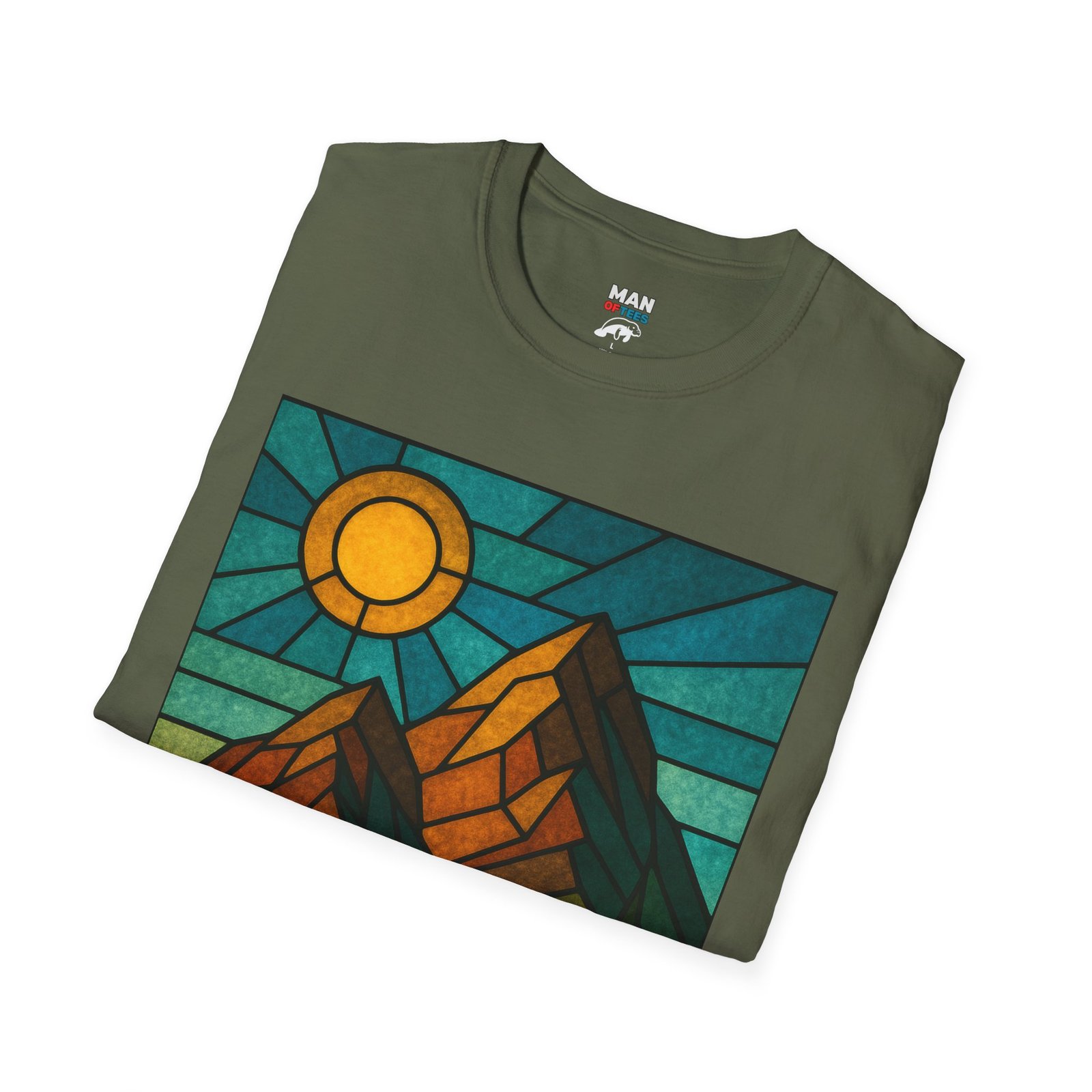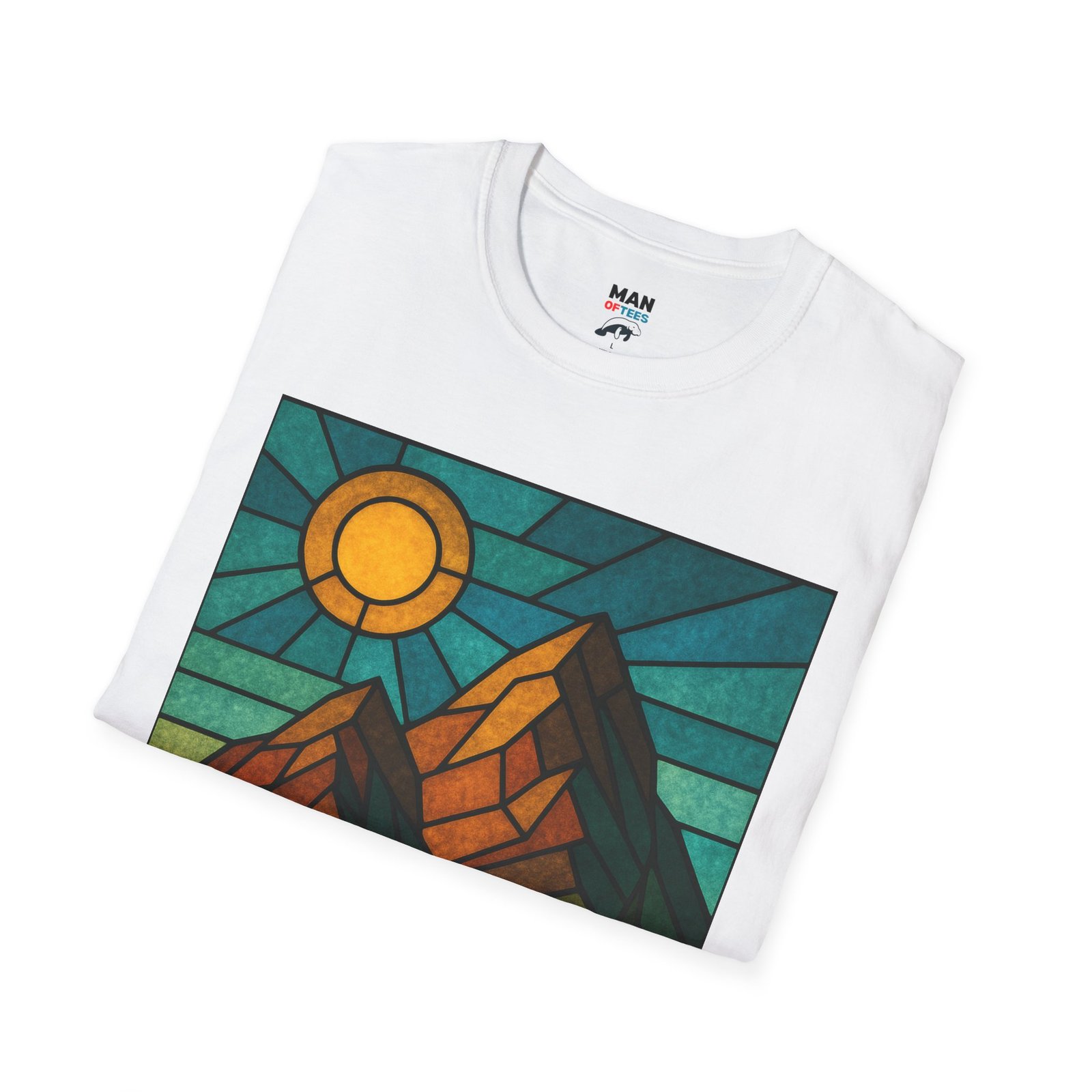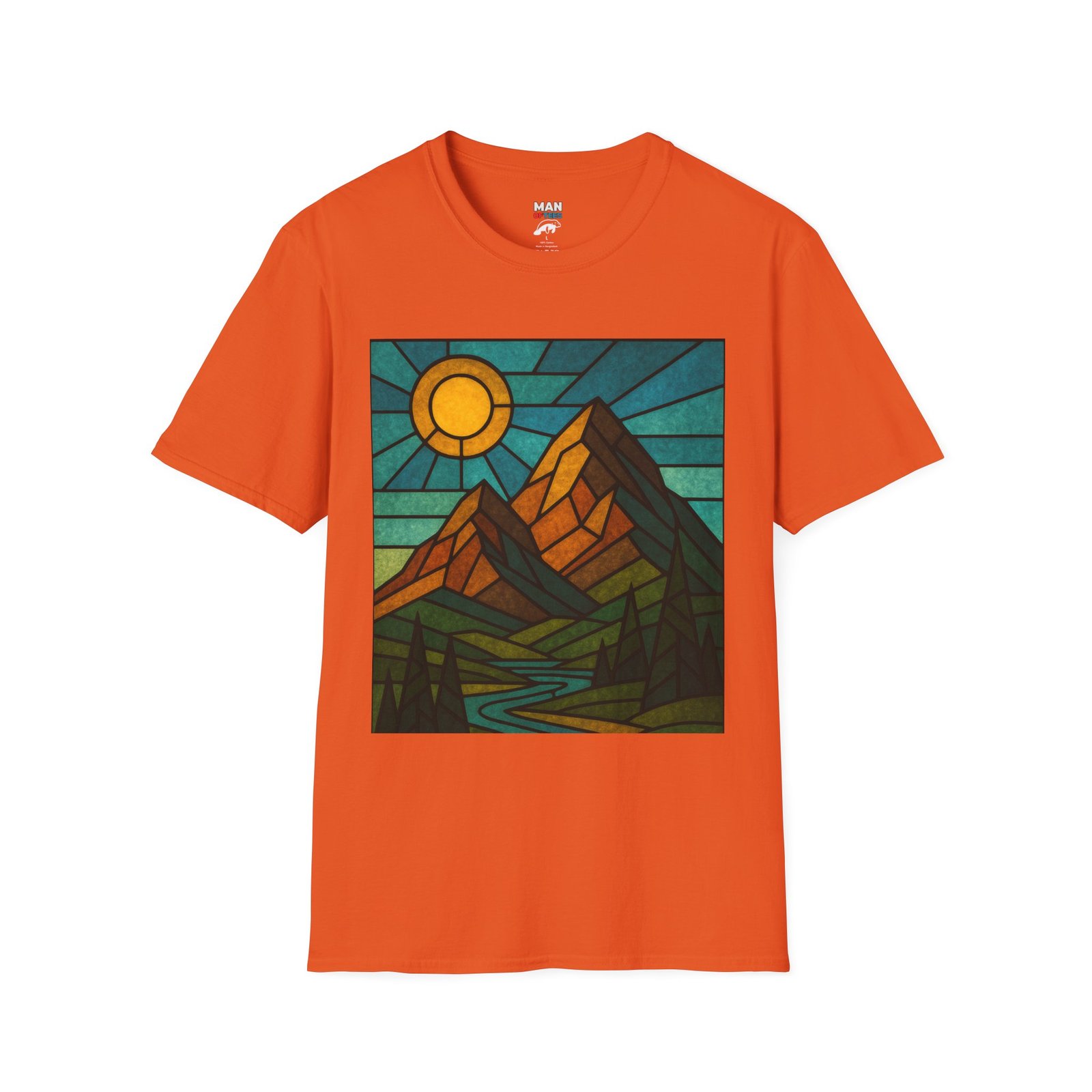 A unisex softstyle T-shirt featuring a stained glass style mountain range with a sun and blue skies behind. This T-shirt is perfect for nature lovers and outdoor enthusiasts. It gives off a peaceful and adventurous vibe, fitting into a buyer’s casual wardrobe seamlessly. Ideal for those who enjoy hiking, camping, or exploring the great outdoors. Relevant for Earth Day, hiking trips, and summer adventures.