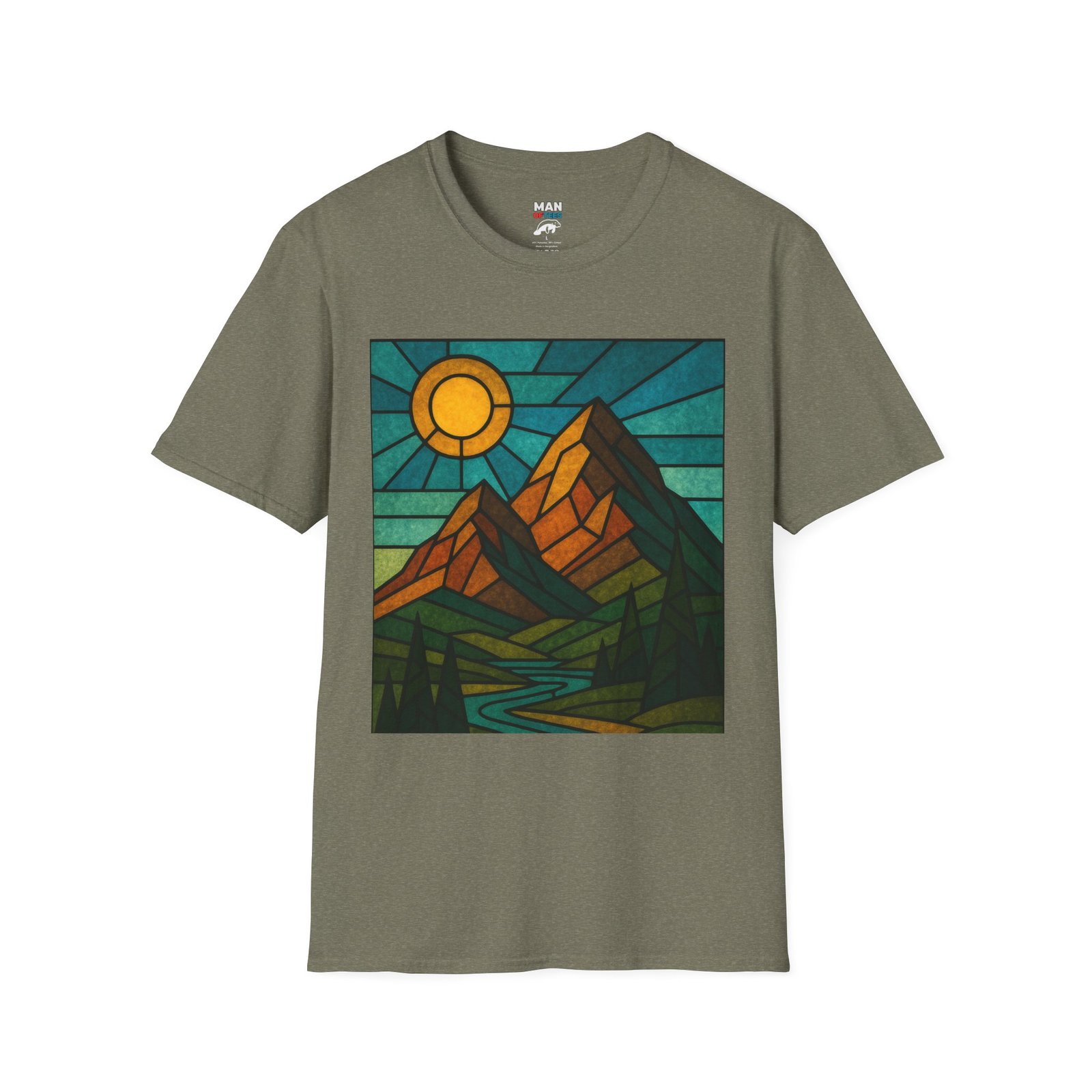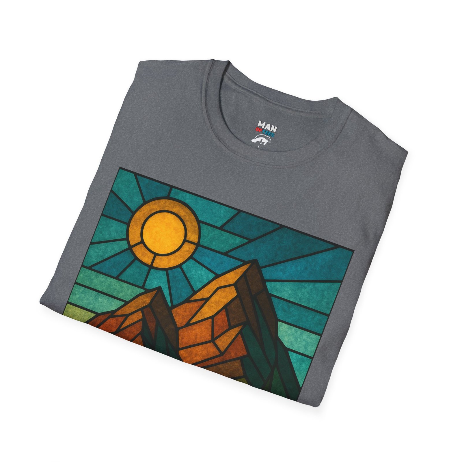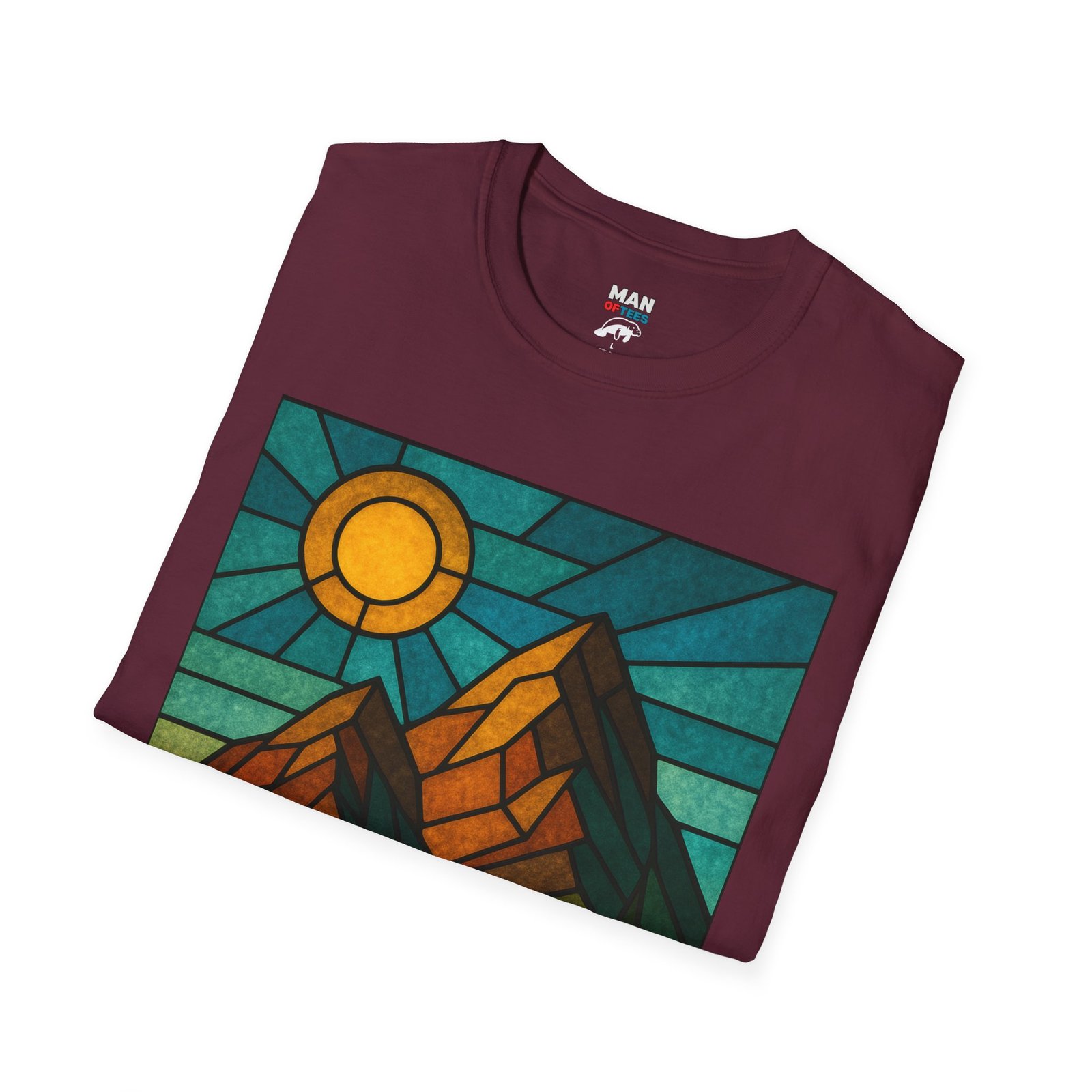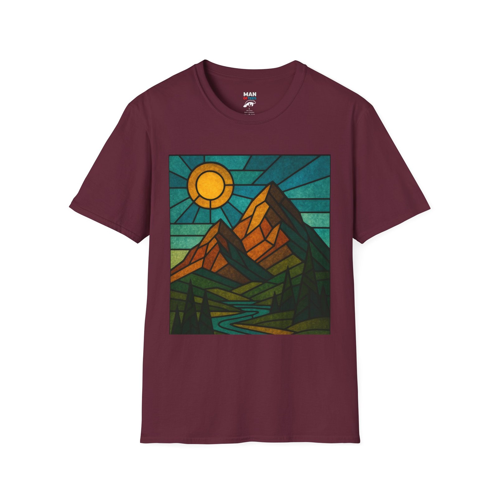A unisex softstyle T-shirt featuring a stained glass style mountain range with a sun and blue skies behind. This T-shirt is perfect for nature lovers and outdoor enthusiasts. It gives off a peaceful and adventurous vibe, fitting into a buyer’s casual wardrobe seamlessly. Ideal for those who enjoy hiking, camping, or exploring the great outdoors. Relevant for Earth Day, hiking trips, and summer adventures.